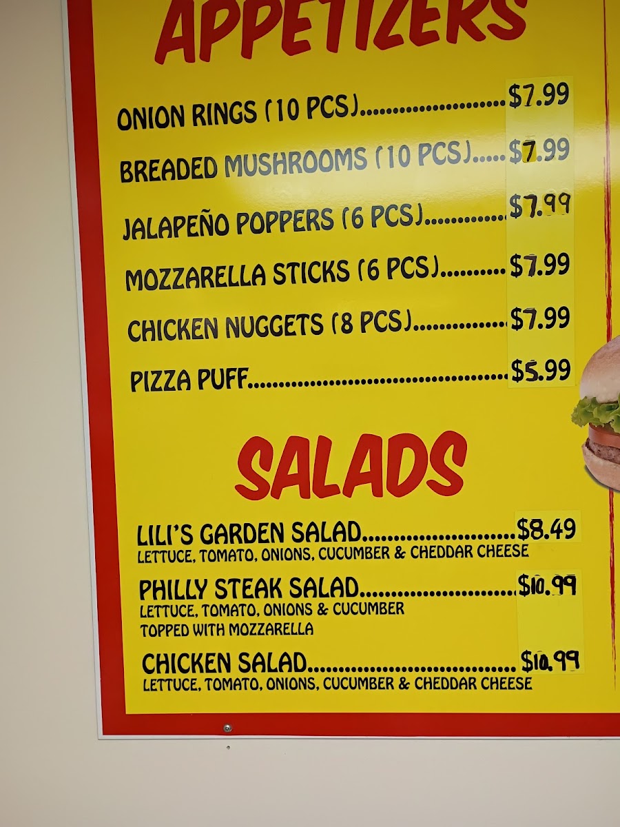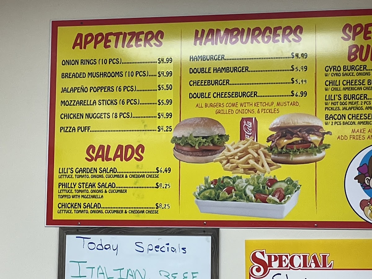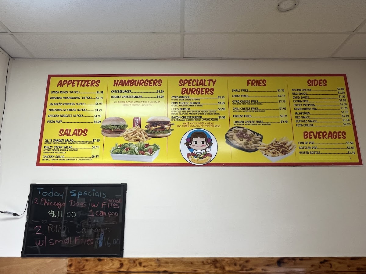 Lili’S Hot Dogs at 16 S Locust St offers a menu that’s a true playground for comfort food enthusiasts. The specialty burgers like the Gyro Burger, Chili Cheese Burger, and Bacon Cheeseburger showcase hearty options for burger lovers, while the hot dogs section, including the iconic Chicago Style Hot Dog, Cheese Dog, and Gyro Dog, delivers classic and creative twists. For those craving beef sandwiches, choices such as the Italian Beef, BBQ Beef, Italian Sausage, and Meatball Sandwich offer rich, savory flavors. The gyros-from the Gyro Sandwich to the BBQ Gyro-bring a Mediterranean touch, complemented by a variety of sandwiches including Grilled Chicken, Breaded Chicken, and Chicken Philly. Side options are equally enticing, with Small Fries, Large Fries, Gyro Cheese Fries, and Chili Cheese Fries, alongside appetizers like Onion Rings (10 pcs), Breaded Mushrooms (10 pcs), Jalapeño Poppers (6 pcs), and Mozzarella Sticks (6 pcs). Fresh salads like Lili's Garden Salad, Philly Steak Salad, and Chicken Salad add a lighter balance, while beverages including Can of Pop, Bottled Pop, and Water Bottle round out the menu. Classic hamburgers such as the Cheeseburger and Double Cheeseburger, plus a sweet treat like Mexican Ice Cream, make Lili’s Hot Dogs a well-rounded stop for anyone seeking indulgent, satisfying meals at reasonable prices.