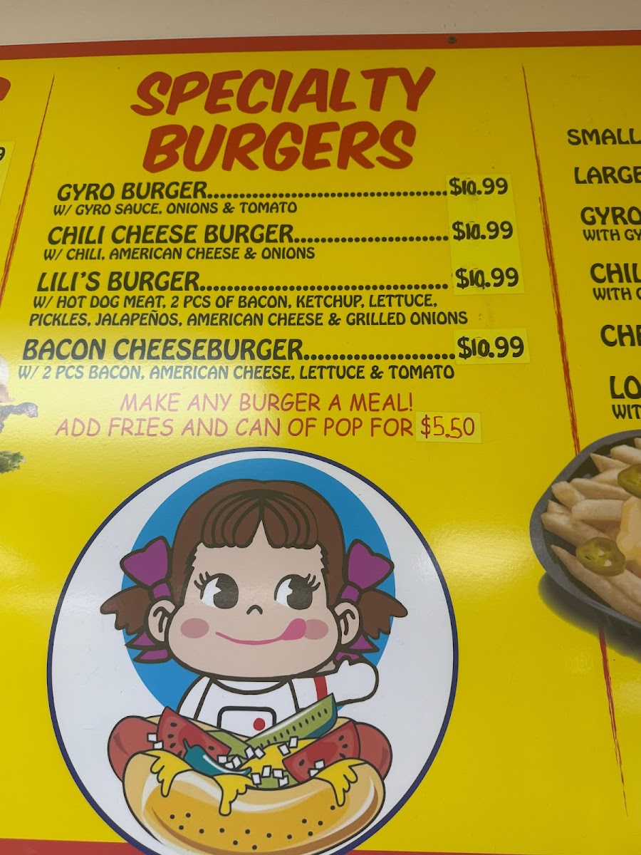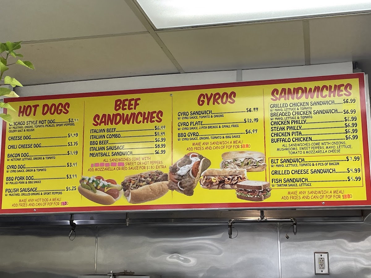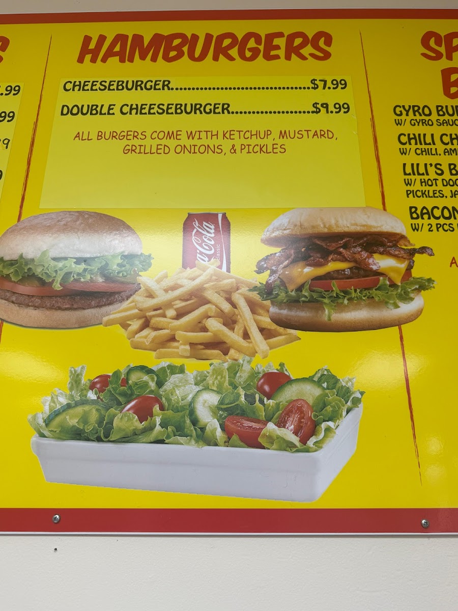 Lili’S Hot Dogs at 16 S Locust St offers a menu that’s a true playground for comfort food enthusiasts. The specialty burgers like the Gyro Burger, Chili Cheese Burger, and Bacon Cheeseburger showcase hearty options for burger lovers, while the hot dogs section, including the iconic Chicago Style Hot Dog, Cheese Dog, and Gyro Dog, delivers classic and creative twists. For those craving beef sandwiches, choices such as the Italian Beef, BBQ Beef, Italian Sausage, and Meatball Sandwich offer rich, savory flavors. The gyros-from the Gyro Sandwich to the BBQ Gyro-bring a Mediterranean touch, complemented by a variety of sandwiches including Grilled Chicken, Breaded Chicken, and Chicken Philly. Side options are equally enticing, with Small Fries, Large Fries, Gyro Cheese Fries, and Chili Cheese Fries, alongside appetizers like Onion Rings (10 pcs), Breaded Mushrooms (10 pcs), Jalapeño Poppers (6 pcs), and Mozzarella Sticks (6 pcs). Fresh salads like Lili's Garden Salad, Philly Steak Salad, and Chicken Salad add a lighter balance, while beverages including Can of Pop, Bottled Pop, and Water Bottle round out the menu. Classic hamburgers such as the Cheeseburger and Double Cheeseburger, plus a sweet treat like Mexican Ice Cream, make Lili’s Hot Dogs a well-rounded stop for anyone seeking indulgent, satisfying meals at reasonable prices.